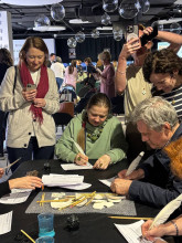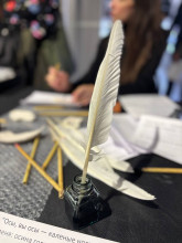 После лекции гости попробовали писать настоящими гусиными перьями, тростниковыми палочками и самодельными чернилами. Это был неожиданный и интересный опыт, особенно для юных участников мероприятия.