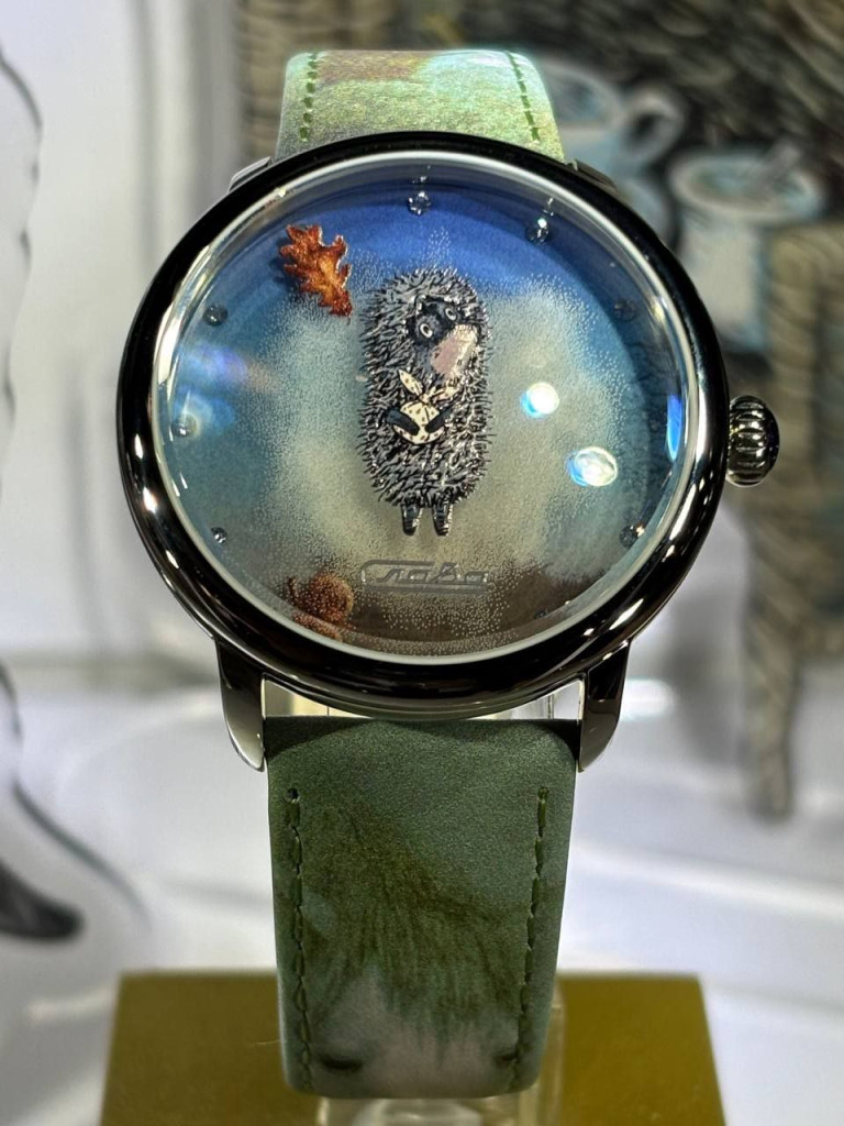 Часы, несомненно, станут хитом: на изящном циферблате изображен Ёжик на фоне загадочного клубящегося тумана, оживляющий волшебный мир мультфильма. Внимание к деталям подчеркивается изображениями знакомых элементов: ползущая по краю циферблата улитка отвечает за показания часов, а дубовый листок отсчитывает минуты.