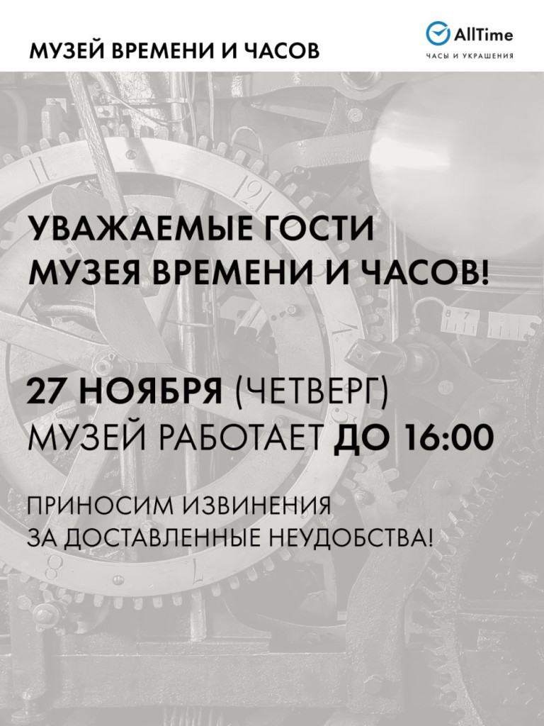 Обращаем Ваше внимание, что 27 ноября (четверг) Музей работает до 16:00.