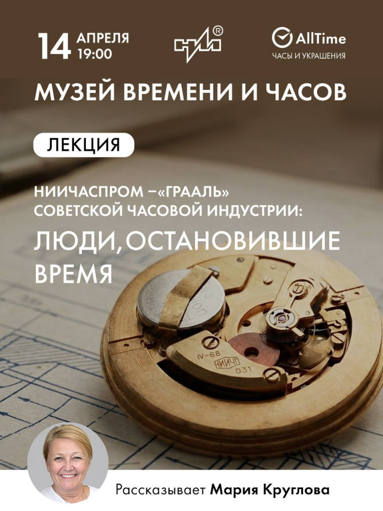 Музей Времени и Часов приглашает 14 апреля в 19:00 на лекцию кандидата культурологии, доцента РГУ им. А.Н. Косыгина Марии Кругловой «НИИЧАСПРОМ — «Грааль» советской часовой индустрии: люди, остановившие время».