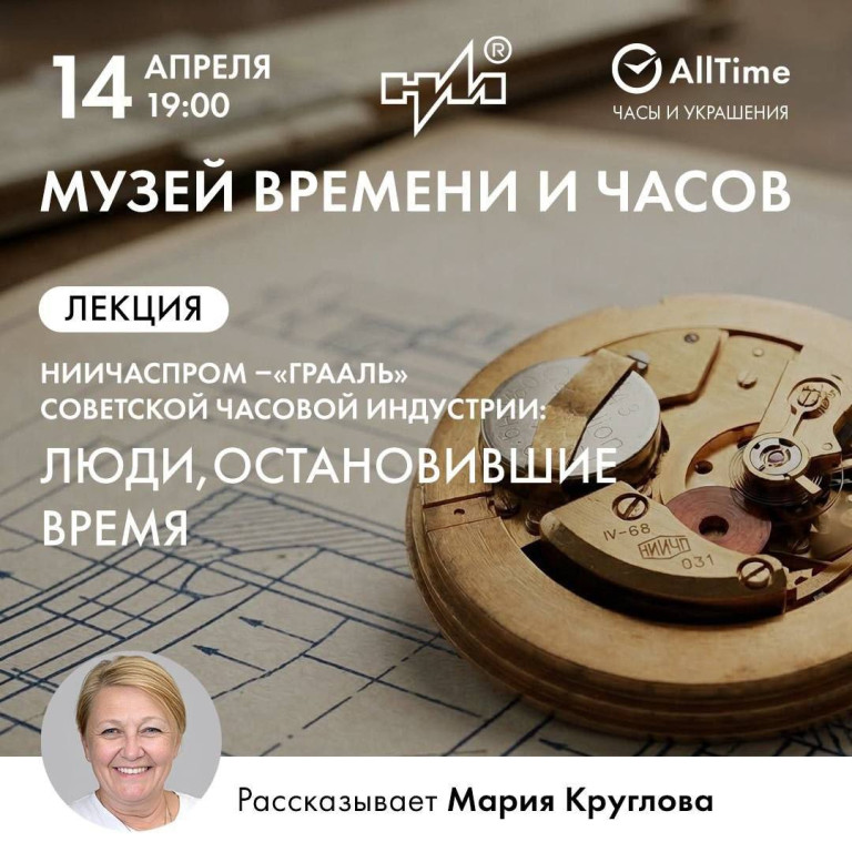 Музей Времени и Часов напоминает, что сегодня, 14 апреля, в 19:00 состоится лекция «НИИЧАСПРОМ — «Грааль» советской часовой индустрии: люди, остановившие время».