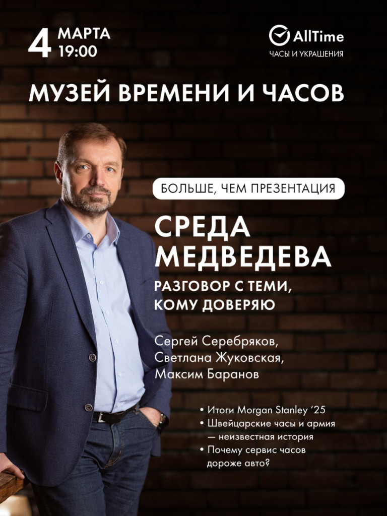 Музей Времени и Часов напоминает о том, что завтра, 4 марта (среда), в 19:00 состоится встреча «Среда Медведева»: больше, чем просто презентация!