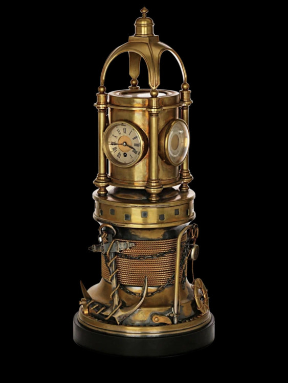 «Необычные по оформлению часы на индустриальную и морскую темы стали ярким явлением в области декоративно-прикладного и часового искусства в конце XIX — начале XX века. Многие музеи и частные коллекционеры все больше проявляют интерес к таким произведениям. На выставке французских часов XVIII–XIX веков из собрания Государственного исторического музея и частных коллекций, проходившей в Историческом музее в 2012 году, внимание посетителей было приковано в том числе к необычным образцам, отличавшимся фантазийными конструкциями и подвижностью деталей.